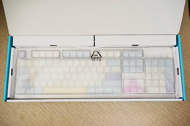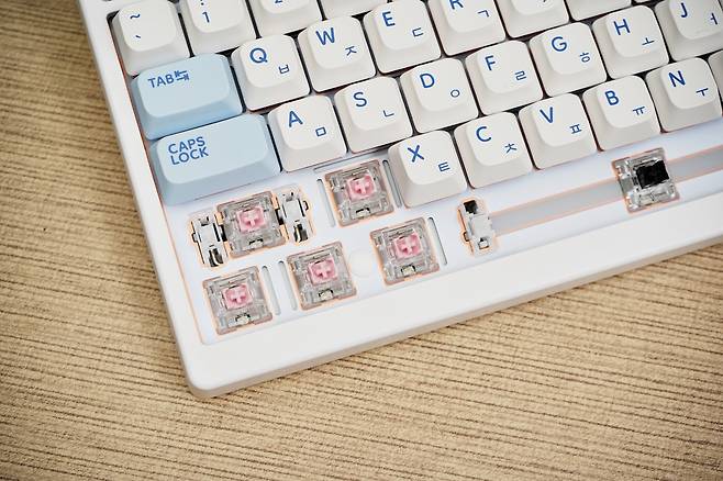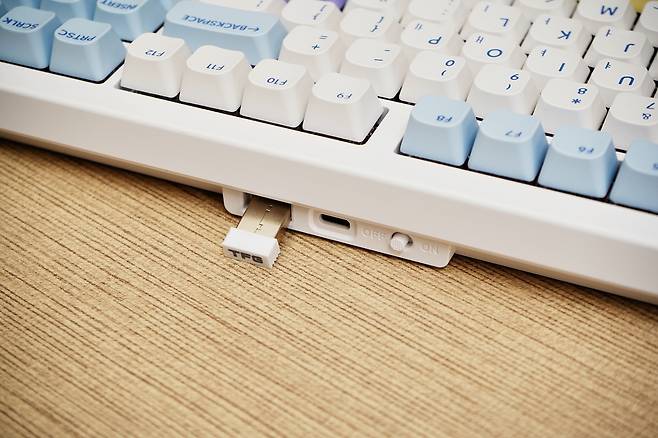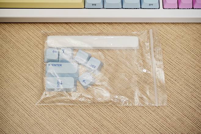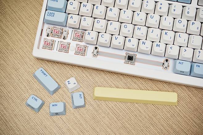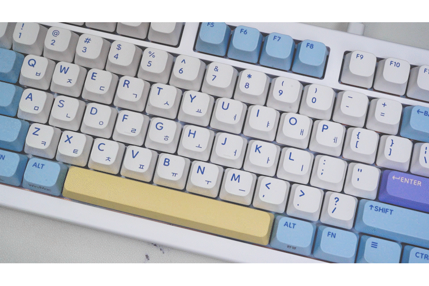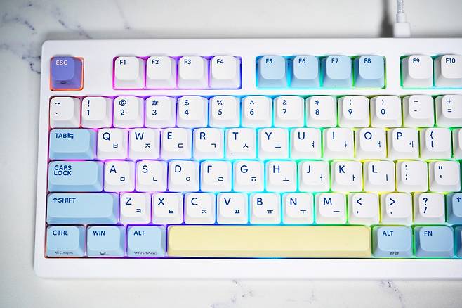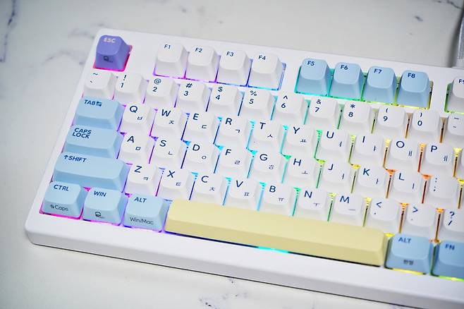 만약 이렇게 톡톡튀는 색상이 싫은 유저를 위해서 기본적인 하얀색과 하늘색 투톤으로 사용할 수 있도록 여분의 키캡도 제공이 됩니다.