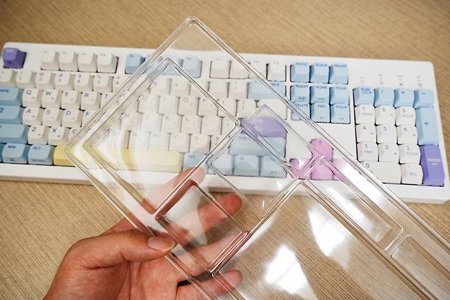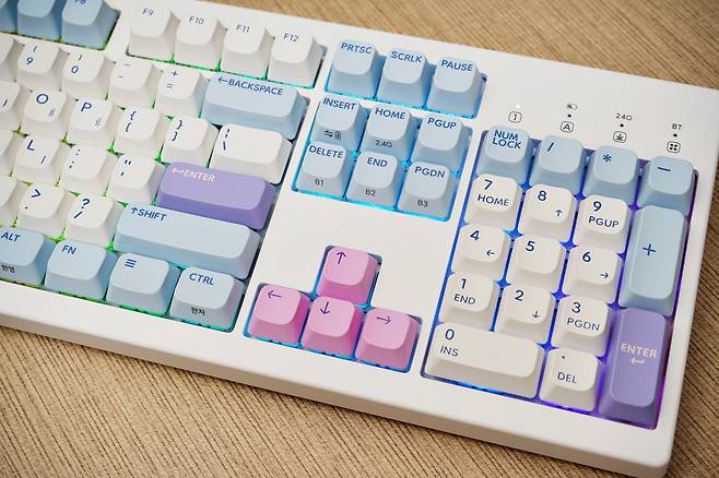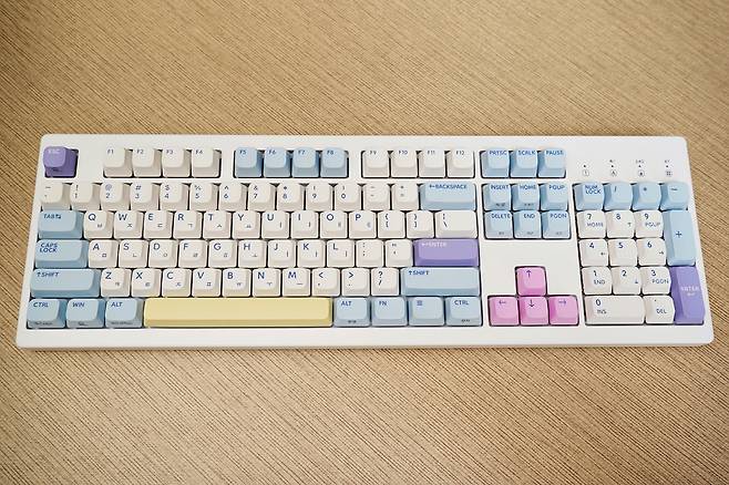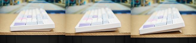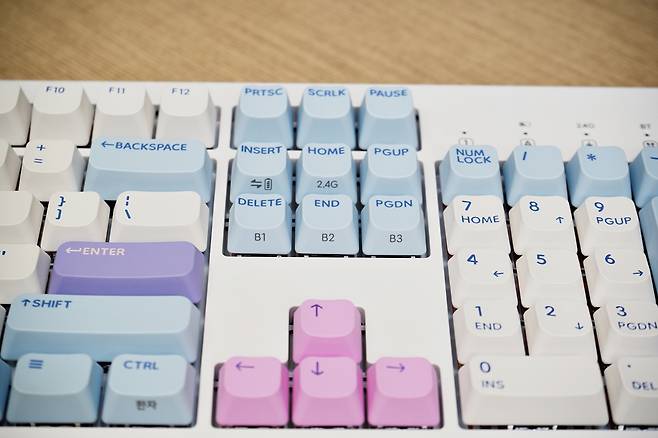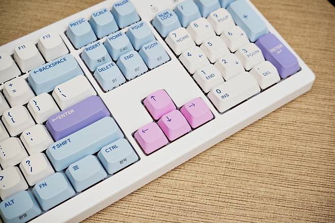 이중 사출 방식으로 제작된 PBT 키캡은 내구성이 좋고 컬러는 코튼캔디, 비너스네이비, 퍼플하트 이렇게 세 가지 컬러로 선택할 수 있어 다양한 취향을 만족시킬 수 있습니다. 저의 경우에는 퍼플하트 컬러입니다.