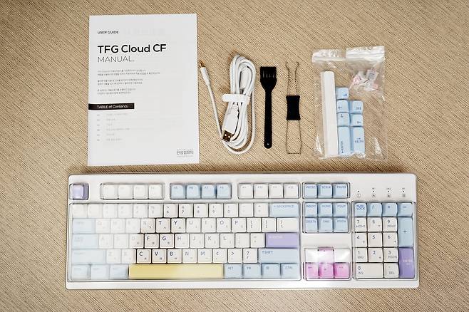제품 구성품입니다. 한성컴퓨터 TFG Cloud CF 본체와 여분의 키캡,스위치, USB-C 케이블, 키캡리무버,청소솔,설명서로 구성되어 있습니다.
