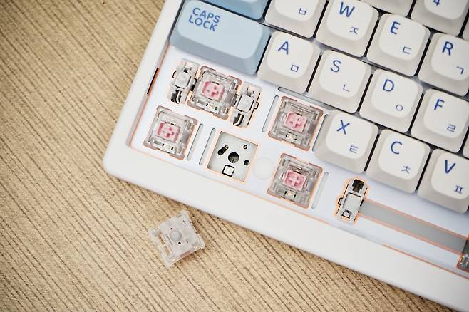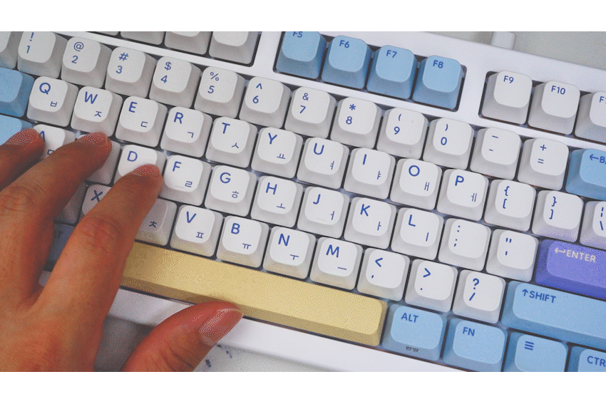 타이핑시에는 저항감이 전혀없고 스무스하게 손가락을 이동할 수 있을 정도로 부드러운 질감과 키압은 너무 가볍지도 무겁지도 않은 40g입니다. 단 스페이스바에는 기본 스위치보다 키압을 +10g 추가한 50g 키압의 블랙 스템 스위치가 있어 좀 더 손맛이 있고 키압 10g의 차이를 체험해보기에도 좋았습니다.