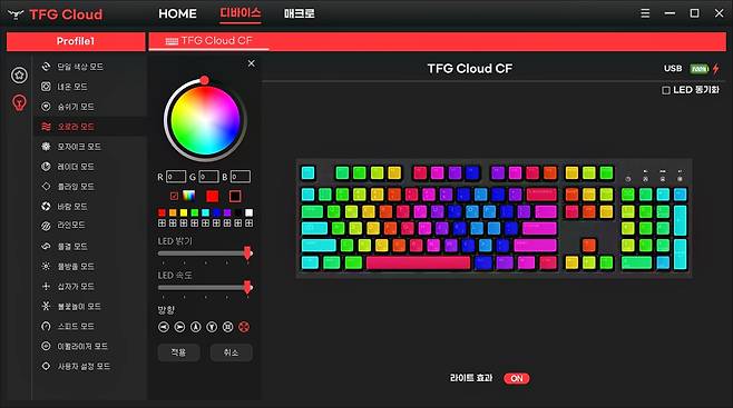 단일색상, 네온, 숨쉬기, 오로라, 모자이크, 레이더, 플라잉, 바람, 라인, 물결, 물방울, 십자가, 불꽃놀이, 스피드, 이컬라이저, 사용자 설정 정말 다양한 모드와 색상,조명이동방향 등 커스텀 할 수 있는 부분들이 상당히 많아서 화려한 RGB조명이 있는 키보드를 좋아하시는 분들에게도 추천드리고 싶습니다.