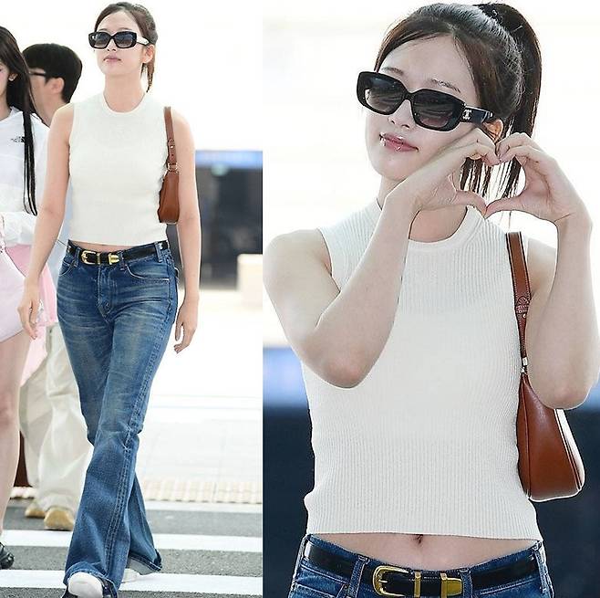 상의는 단정한 골지 텍스처와 크림빛 컬러로 청량한 이미지를 배가했고, 데님은 골반 라인과 다리 실루엣을 강조한 하이웨이스트 스타일로 안유진 특유의 비율 좋은 몸매를 더욱 돋보이게 했습니다.