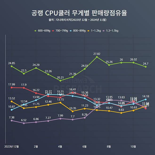 하지만, 소비자의 선호도가 듀얼 타워로 이전된다고 해도 CPU 쿨러 자체의 무게가 급격하게 무거워지는 경향은 보이지 않는다. 그동안 1위를 달리던 700g 대 제품의 판매량 점유율이 계속 하락하여 11%대까지 떨어지고 오히려 더 가벼운 600g 대 제품군이 계속 20% 중반 대 점유율을 유지해 1위 자리를 지키고 있는 것이다. 이런 성향은 비단 700g 제품군에 해당하는 이야기가 아니라 800g, 1kg 이상급 공랭 CPU 쿨러들도 비슷한 처지다. 그나마 800g 대 제품군이 14%로 2위지만 그 하위 제품군과 점유율 차이가 거의 없다. 하여 공랭 CPU 쿨러 시장은 600g 대 제품군과 그 나머지 제품군으로 이루어진 양강 구도가 지배적이라 하겠다.