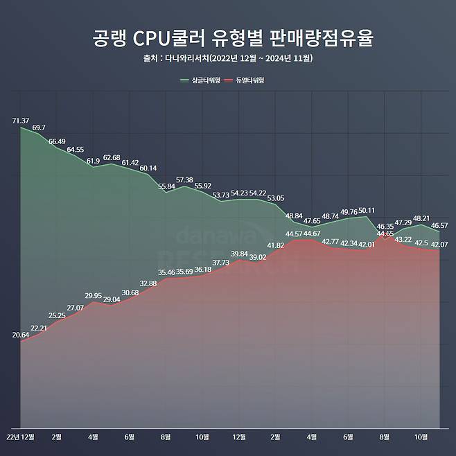 그동안 공랭 CPU 쿨러 시장은 싱글 타워, 즉 히트싱크 1열에 쿨링팬 1개가 붙는 방식이 대세였다. 케이스 내부 공간의 제약이나 메인보드 전원부, 메모리의 간섭이 가장 적어 유저들이 선호하는 방식이다. 또한, 가장 단순한 구조의 CPU 쿨러로 제일 오래된 CPU 쿨러의 클래식이라 할 수 있다. 하지만, 시간이 흘러 2024년 현재에는 히트싱크 2열에 쿨링팬 2개를 다는 듀얼 타워형이 계속 상승세를 타며 싱글 타워 쿨러의 자리를 압박하는 중이다. 심지어 2024년 8월엔 1위 자리를 내주기도 했다. 지금은 다시 싱글 타워 46.57%, 듀얼 타워 42.07% 수준으로 순위가 원복 되었지만, 싱글 타워 방식의 자리는 날이 갈수록 위태해지는 상황이다.