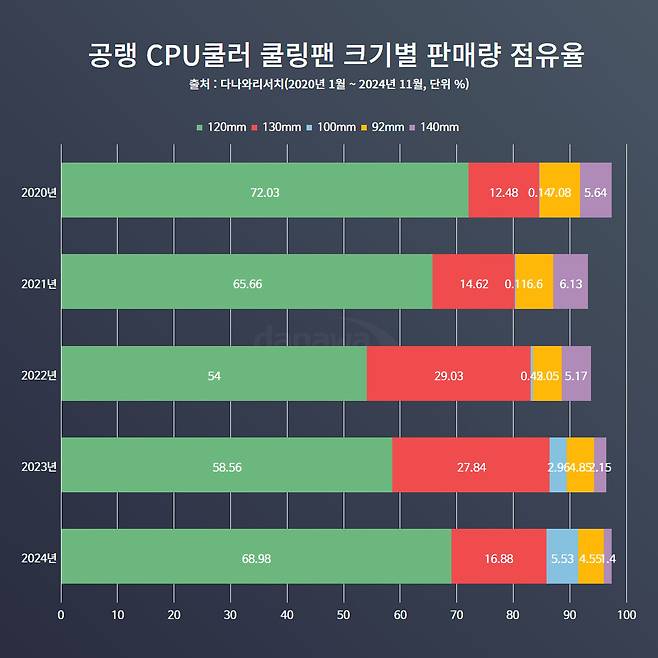 또 한 가지 흥미로운 점은 쿨링팬의 크기다. 듀얼 타워가 흥하다고 쿨링팬의 크기가 마냥 커지는 게 아니라는 것이 관측되었다. 다나와 리서치 데이터가 기록되기 시작한 2020년부터 공랭 CPU 쿨러에는 120mm 쿨링팬이 70%대 판매량 점유율로 절대다수를 차지하고 있었다. 2년의 시간이 흐른 후 2022년엔 54%까지 내려갔지만 이내 2024년에는 68.98% 점유율로 회복되며 1위를 계속 지키고 있다. 그다음으로 점유율이 높은 쿨링팬은 130mm인데 2022년에 29.03까지 올라갔었지만, 이내 하락해 16.88%를 기록했다. 이는 PC 케이스 내부의 물리적 한계 때문에 히트싱크의 높이가 제한되므로 120mm 쿨링팬을 달 수밖에 없다는 게 증명된 셈이다. 듀얼 타워 타입이 케이스 측면 방향으로 커지는 게 아니라 Z 축으로 중첩되는 방향으로 발전하는 것도 같은 이유다. 따라서 120mm 쿨링팬은 공랭 CPU 쿨러의 필수 요소로 계속 이어질 것이라 예상된다.