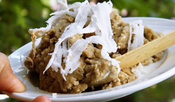마지막으로 고구마와 설탕을 섞어주세요. 서빙하려면 조림 고구마 한 줌을 바나나 잎 위에 올리고 그 위에 잘게 썬 코코넛 과육을 얹으세요. 쫄깃하면서도 부드러운 고구마는 바삭하고 기름지고 담백한 달콤한 코코넛 과육과 잘 어울립니다. 전통적으로 그들은 이 음식을 먹을 때 맛을 높이기 위해 대나무 숟가락을 사용합니다.
