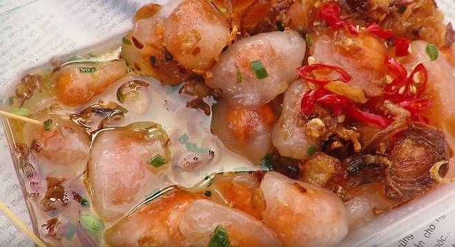 소를 만들기 위해 다진 삼겹살, 새우살, 소금, 후추가루, 설탕을 넣고 볶습니다. 크러스트를 만들려면 타피오카 가루에 끓는 물을 붓고 반죽이 끈적해질 때까지 치댄 다음 반죽을 작고 얇은 원형 시트로 만들고, 타피오카 시트에 들어 있는 충전물을 반원형으로 감싸서 크러스트가 투명해질 때까지 끓입니다. 케이크를 찬물에 담근 후 기름을 둘러주세요. 그 위에 잘게 썬 파, 튀긴 샬롯, 튀긴 돼지기름, 칠리 고추 조각(선택 사항)을 얹습니다. 판티엣에서 퀘이박 케이크를 한 입 먹으면 타피오카 가루의 쫄깃한 식감과 새우와 돼지고기의 짭조름한 맛, 혀에 찍어먹는 생선 소스의 새콤달콤한 맛이 완벽한 조화를 이루는 것을 느낄 수 있습니다. .