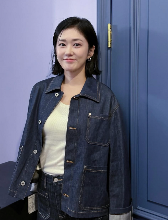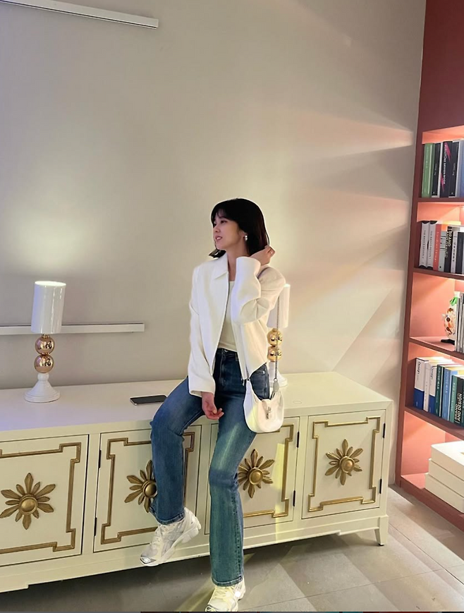 부츠컷 데님팬츠에 화이트 재킷, 운동화를 매치하여 캐주얼한 패션을 연출했다. 여기에 화이트 숄더백을 더해 세련된 무드를 강조하며, 편안하면서도 스타일리시한 일상룩을 완성했다.