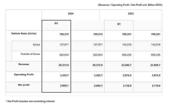 전동화 전환에 집중하고 있는 기아차의 2024년 1분기 전세계 판매량은 76만 515대, 전년 대비 1% 판매량이 줄었다. 하지만 1분기 매출액은 26조2129억원, 영업이익은 3조4257억원으로 영업이익률 13.1%를 기록해 역대 최고의 분기 영업이익 및 영업이익률을 달성했다. 호실적의 주요 요인으로 SUV 모델 판매량의 증가도 돋보인다. 1분기 SUV 판매량 비중은 전년도 65%에서 성장한 70%에 달한다.