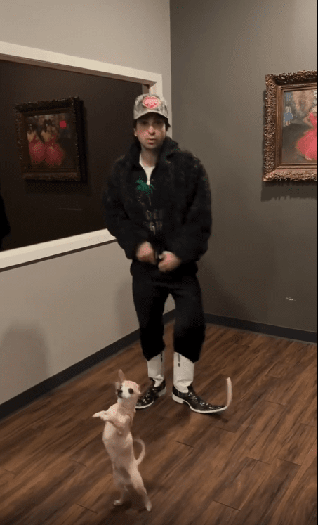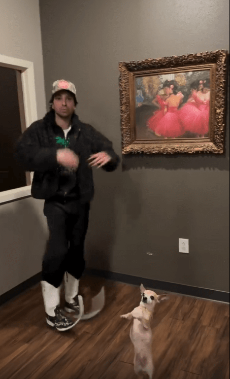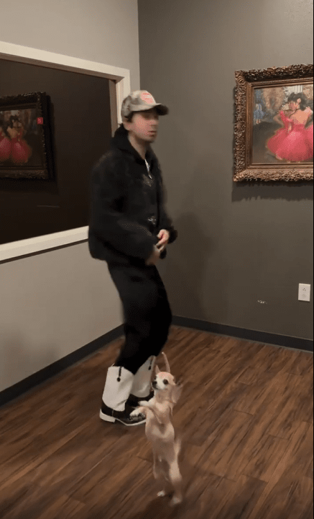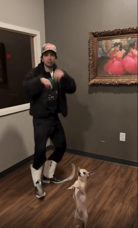 특히 남성이 발을 빠르게 움직이며 춤의 박자를 바꿀 때마다, 강아지도 가만히 서 있는 것이 아니라 그 흐름을 느끼며 반응합니다. 마치 오랜 시간 함께 연습한 파트너처럼 자연스럽게 옆에서 춤을 맞추는 듯 보입니다. 그야말로 ‘음악이 흐르면 몸이 먼저 반응하는 타입’인 것 같네요.