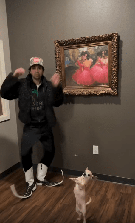 한 남성이 멕시코 음악 장르에 맞춰 경쾌하게 춤을 추고 있습니다. 발을 빠르게 움직이며 리듬을 타는 그의 모습은 마치 축제 현장에 온 듯한 분위기를 자아냅니다. 하지만 이 장면에서 가장 눈에 띄는 존재는 바로 그의 옆에서 함께 춤을 추는 강아지입니다.