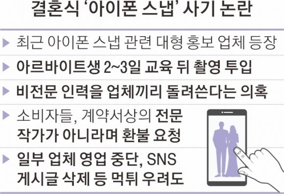 지난 3월 결혼한 직장인 이모(37)씨는 유튜브 홍보 영상에서 본 뒤 25만원을 주고 계약한 ‘아이폰 스냅’만 생각하면 분통이 터진다. 아이폰 스냅은 DSLR 카메라로 촬영하는 웨딩사진과 별도로, 결혼식 당일 여러 순간을 휴대전화로 손쉽게 빨리 찍는 방식의 사진 등을 말한다. 이씨는 “20대를 갓 넘긴듯한 앳된 여성분이 휴대전화를 들고 결혼식 당일 기웃거리기에 인사했더니 아이폰 스냅 업체가 말한 저명한 경력의 ‘전속작가’였다”며 “결과물을 받았더니 지인들이 보내준 것보다 영상 길이는 짧고 사진 품질도 형편없었다”고 전했다. 업체에 항의했지만 묵묵부답이었다. 권모(30)씨도 “엉망인 아이폰 스냅사진을 받고 업체 고소 등 법적 조치까지 생각했지만 20만원 가량 소액인데다 사업자등록번호 없이 소셜미디어(SNS)상으로만 운영해 사실상 접촉도 불가능했다”고 했다.