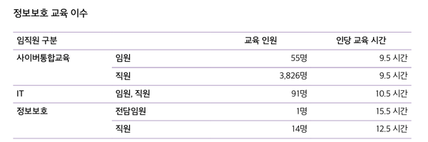 IT 수탁자도 교육 대상에 포함된다. 연 4회 피싱 대응 이메일 훈련과 연 1회 침해사고 대응 모의훈련도 진행된다. 이를 위해 금융보안원과 사이버원 등 침해 대응 전문기관과 협력해 24시간 365일 침입 탐지 및 보안 관제를 운영하고 있다.