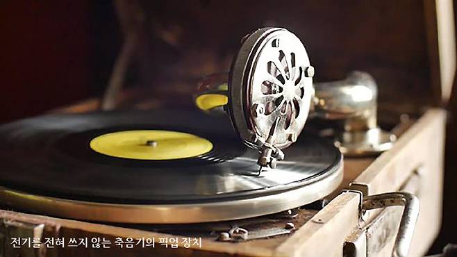 물론 잡음이 있고, 태엽을 감아서 돌아가는 턴테이블은 회전속도가 일정하지 않아서 소리가 늘어지기도 했지만, 아무런 전기장치 없이 그렇게 큰 소리를 낸다는 게 정말로 신기합니다.