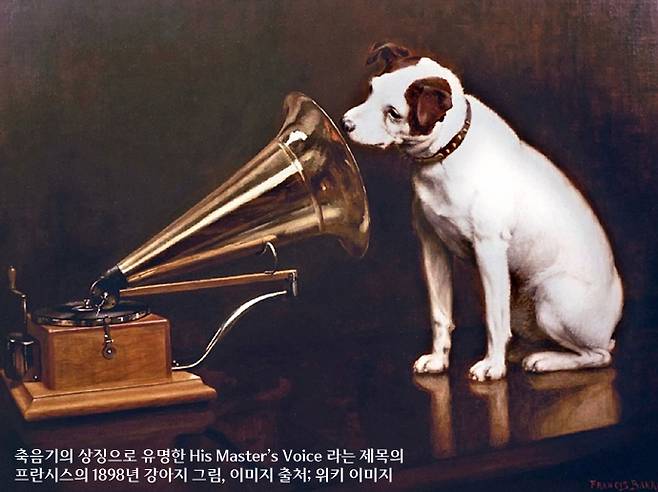 그런데 축음기 하면 떠오르는 것이 축음기의 나팔을 신기한 듯이 들여다 보고 있는 반려견의 모습인데요, 알려진 바에 의하면, 프란시스 바라우드(Francis Barraud; 1856-1924)라는 영국의 화가가 1898년 겨울에 자신의 집에서 축음기의 소리를 신기하게 듣고 있는 그의 형이 기르던 반려견 니퍼(Nipper)의 모습을 그린 것이라고 합니다.