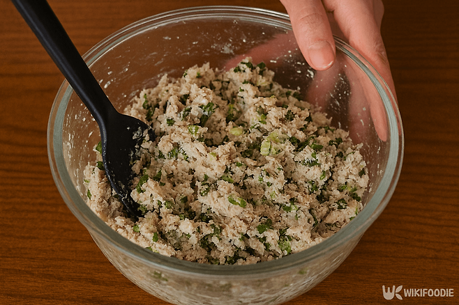 참치도 체에 밭쳐 기름을 빼야 맛이 담백하다. 쪽파는 송송 썰어 향을 더한다. 볼에 두부, 참치, 쪽파를 넣고 소금 한 꼬집과 후추 1/2작은술을 넣어 섞으면 속 재료가 완성된다. 두부가 곱게 으깨지도록 섞는 것이 중요하다. 그래야 속이 부드럽고 모양도 단정하게 잡힌다.