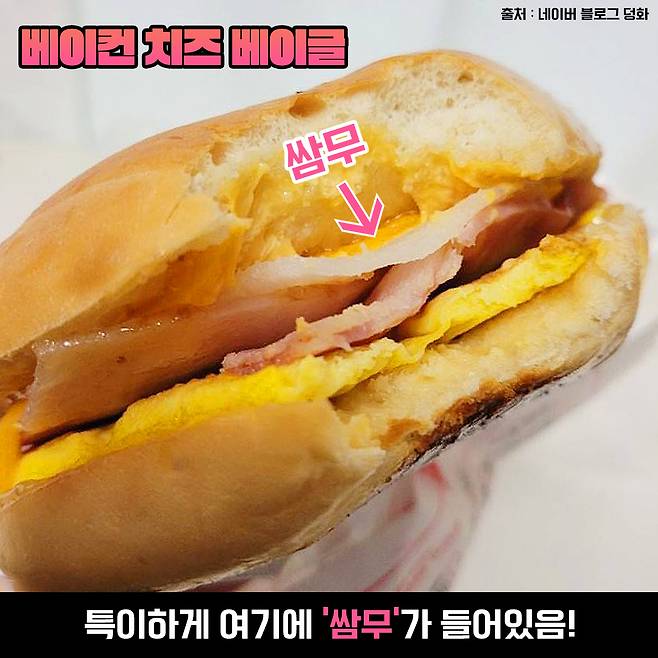 토스트가 아닌 동그란 베이글에 베이컨과 치즈 그리고 특이한 재료가 있는데요. 바로 쌈무입니다! 이게 도대체 무슨 조합이죠? 베이글에 뜬금없이 쌈무라니. 쌈무가 왜 여기서 나와?ㅋㅋㅋ