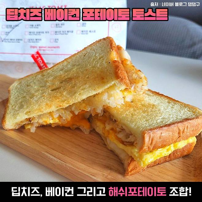 이름 그대로 딥치즈와 베이컨 그리고 해쉬포테이토가 들어가 있어서 토스트 하나로 풍성한 조화를 이룬 이삭의 인기 메뉴입니다! 그리고 여기에 모짜렐라 치즈가 들어가 있어서 한 입 물때마다 쭈욱 늘어나는 치즈가 매력적이라구요~