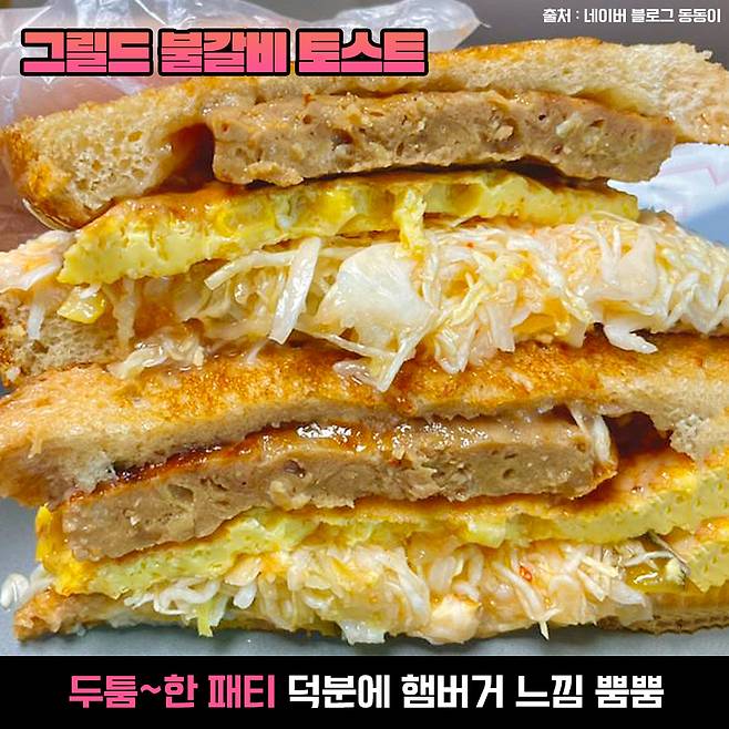 두툼한 불갈비패티 덕분에 토스트가 아닌 햄버거 느낌이 제대로 나는 토스트예요. 양배추와 계란, 옥수수, 치즈, 피클까지 듬뿍 들어가 있어서 속 재료가 든든해서 식사 대용으로 먹어도 포만감을 느끼게 해준답니다!