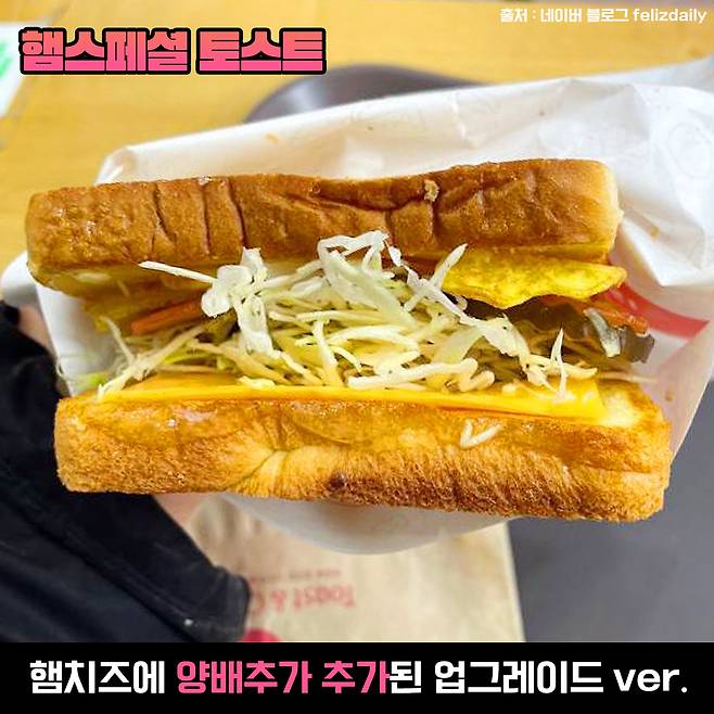재료 중 어느 하나라도 빠진다면 아쉬웠을 텐데 전체적인 맛 조합이 예술인 햄스페셜 토스트 역시 많은 사람들에게 사랑받는 메뉴죠~ 사장님 저는 양배추 많이 올려주쎄요~>_<