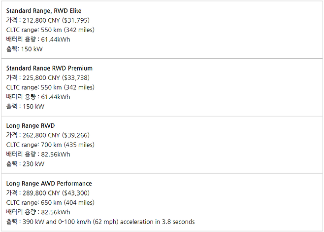 BYD Seal의 트림은 다음과 같다.