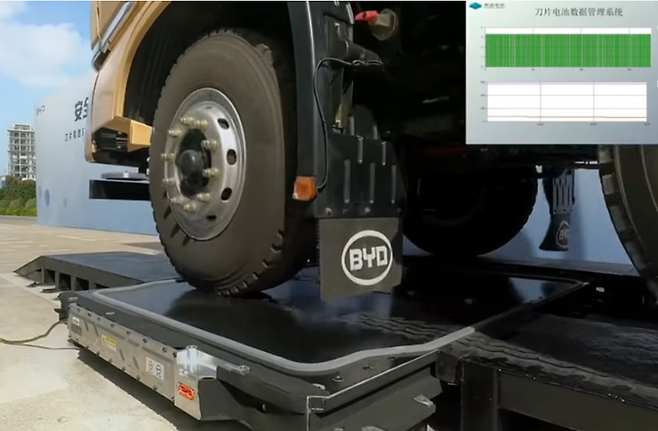 BYD는 CTB 배터리가 얼마나 튼튼한지 보여주기 위해 50ton 트럭이 배터리 위를 밟고 지나가는 영상과 충돌 테스트 영상을 공개했다.