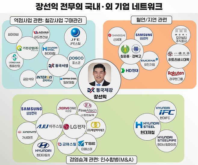 장 전무가 원재료 구매를 총괄하고 있는 또 다른 기업인 동국씨엠은 지난해 말 기준 포스코, 현대제철 등의 국내 철강 기업과 JFE스틸, 일본제철(NSC) 등 일본 철강 기업들로부터 원재료 약 1조원을 매입했다. 일본 1위 철강사인 일본제철은 최근 미국 철강업체 US스틸 인수 의사를 밝혔을 정도로 막강한 자본력을 갖춘 기업이다.