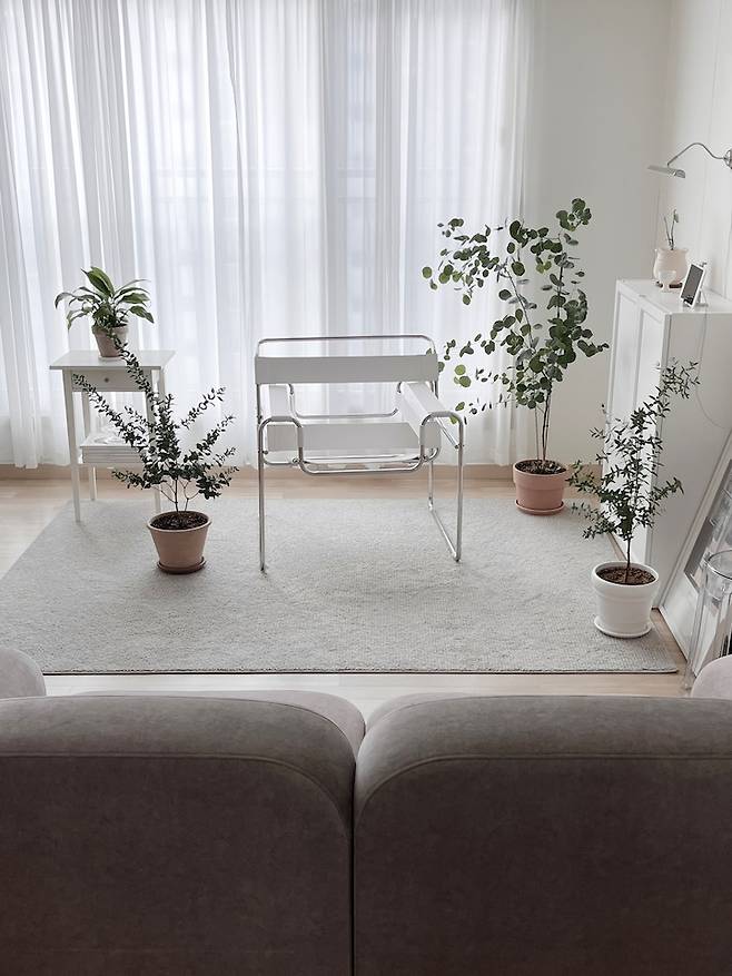 이전에는 모듈 소파를 벽면 또는 창가 쪽에 놓기도 하고 분리해서 대면형으로 놓기도 하며 소파의 배치에 따라 분위기에 변화를 주었었는데요. 지금은 함께하는 식물들이 많아지면서 창가 쪽에는 식물들과 함께 앉을 수 있는 1인용 디자인 체어를 놓고 지내고 있어요. 소파는 주방 쪽으로 배치해 주방과 거실을 분리해주는 역할을 하고 있어요.