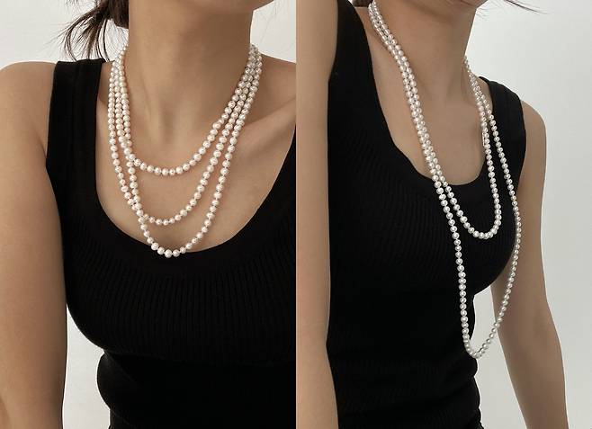 그중에서도 ‘Long Classci Pearl Necklace’를 추천한다. 74cm의 긴 진주목걸이인데 길게 늘어뜨리거나 여러번 둘러메어 짧게 연출할 수 도 있다. 담수진주는 불규칙한 형대로 모든 진주의 형태가 동일 하지 않고 크기 자체도 작은 편이라 과하게 느껴지지 않고 포인트 주기 제격이다. 착장이 너무 심심한 게 아닌가 싶으면 진주목걸이로 완벽한 룩을 완성하자. 구매는 여기(https://bit.ly/3PpsyBR).