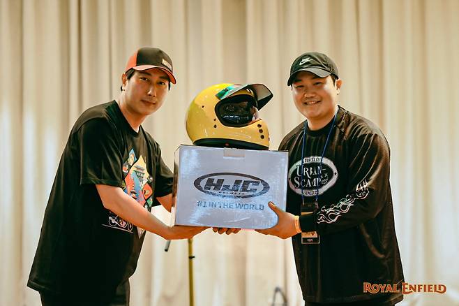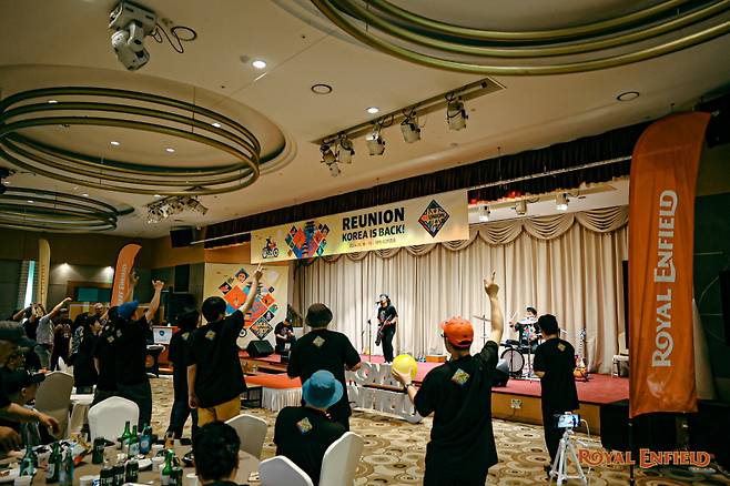 행사에서 빠질 수 없는게 또 럭키드로우 순서인데 로얄엔필드에서 엄청나게 많은 경품들을 준비해와 아까 낮에 진행된 게임에서 좋은 성적을 거둔 참가자들을 시작으로 경품 행사가 진행 됐다. 로얄엔필드에서 많은 선물을 준비한 덕분에 행사에 참가한 참가자들이 양손 무겁게 집에 돌아가실 수 있게됐다. 희비가 엇갈리는 럭키드로우가 끝나고 역시나 행사가 끝나면 남는건 사진 밖에 없다는걸 증명하는 기념 촬영이 끝나고 첫날 행사가 끝나는 듯 싶었으나 열정적인 공연 순서로 이어졌다.