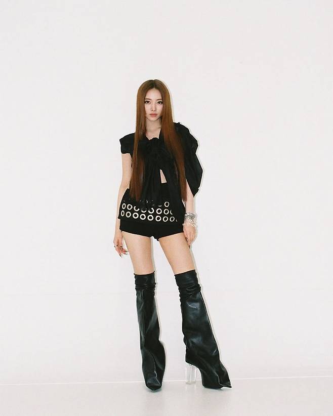 사진 속 안나는 과장된 리본 디테일이 인상적인 블랙 탑과 메탈 아일렛이 장식된 숏팬츠로 강렬한 시선을 유도한다. 블랙의 통일감 속에서도 시스루 소재의 롱부츠가 포인트 역할을 하며, 투명한 힐 디테일로 미래적인 분위기를 더했다. 전체적으로는 매끈한 실루엣과 과감한 노출이 어우러져 Y2K 특유의 당당한 에너지를 발산한다.