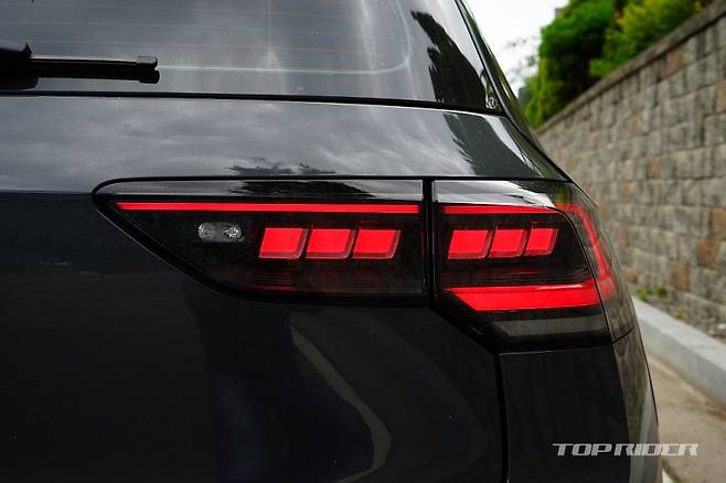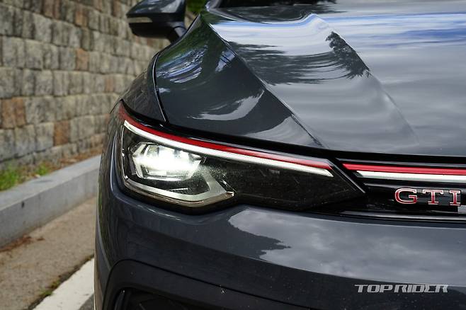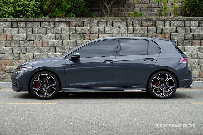 신형 골프 GTI의 외관은 노멀 모델과는 상당히 다른 분위기다. 사이드미러를 통해 보여지는 골프 GTI는 10mm 낮아진 전고와 차체 밖으로 최대한 밀어낸 19인치 휠을 통해 남다른 자세를 보인다. 2025년형 모델은 좌우 헤드램프가 이어지는 그릴 라이팅을 통해 기존 모델과도 차별화된다.