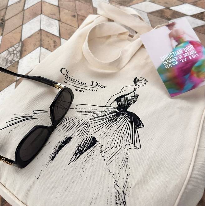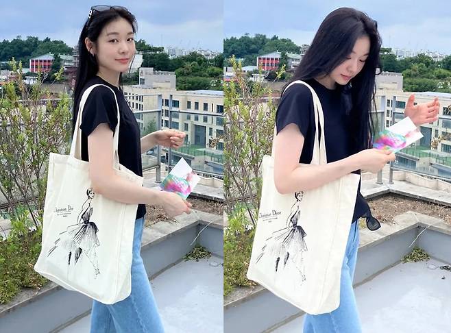 기본 블랙 티셔츠에 연청 데님 팬츠를 매치한 김연아는 깔끔한 분위기를 연출했고, 여기에 크림색 디올 일러스트 에코백을 포인트로 들어 감각적인 데일리룩을 완성했습니다.