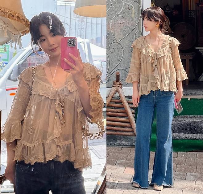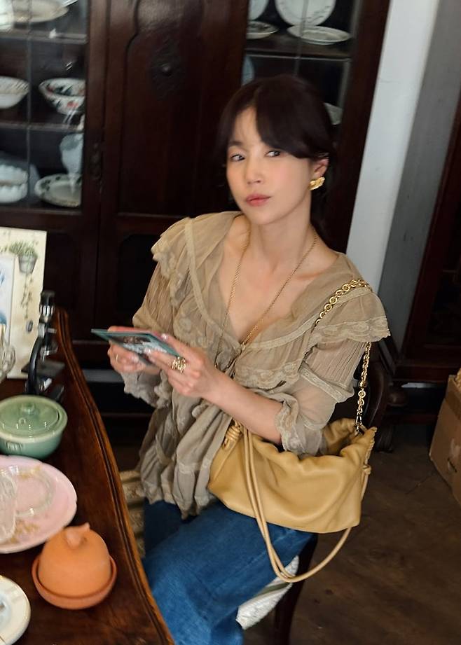 공개한 사진에서 기은세는 은은한 베이지 컬러의 시스루 블라우스를 착용해 보헤미안 무드를 완성했다.