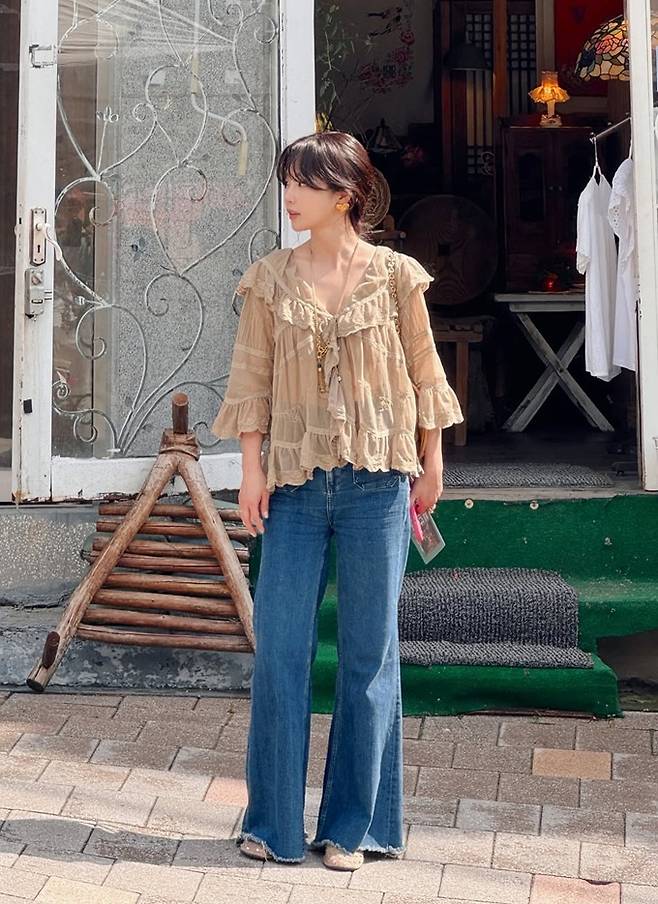 하의는 클래식한 블루 컬러의 와이드 플레어 데님 팬츠로 빈티지한 무드를 강조했다.