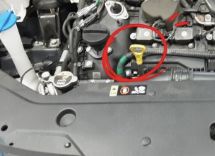 방법: 엔진이 식은 상태에서, 노란색 손잡이의 '엔진오일 게이지'를 뽑아 깨끗이 닦은 뒤, 다시 끝까지 넣었다 빼세요. 오일이 F(Full)와 L(Low) 사이에 찍혀있는지 확인하면 됩니다.