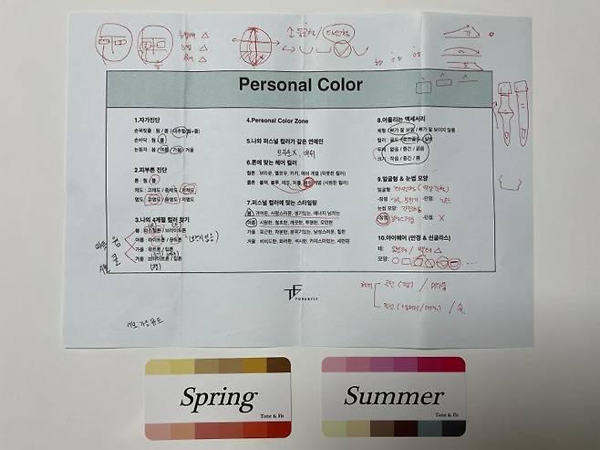 저희는 가장 기본인 베이직 코스로 진행했습니다. 자가 진단, 피부 톤 진단, 나와 맞는 계절 찾기, 퍼스널 컬러 존, 나와 퍼스널 컬러가 같은 연예인, 톤에 맞는 헤어 컬러, 퍼스널 컬러에 맞는 스타일링, 어울리는 액세서리, 얼굴형&눈썹 모양, 아이웨어까지! 퍼스널 컬러를 활용해 제가 더 돋보일 수 있도록 디테일한 스타일링까지 알려주셨습니다.