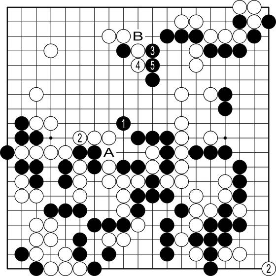 ◆AI의 작품=복잡한 국면을 단순화하는 것은 모든 고수의 특기다. 특히 AI는 단순화의 명인이라 할 만하다. AI는 흑1을 선수하고(손 빼면 흑A로 바로 수가 난다) 3, 5로 연결하면 ‘바둑은 끝’이라고 말한다. 간단하고 멋진 작품이다. B의 맛이 있어 이 흑은 끊기지 않는다. 끊어지지 않으면 흑의 대승이다.