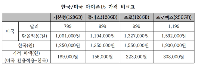 9월 15일 기준 전날 원/달러 마감 환율(달러당 1,327.8원)을 적용, 아이폰15 기본모델의 미국 판매 가격(799달러)을 원화로 환산하면 106만1000원에 불과하다. 한국에서 미국보다 18만9000원(17.8%) 비싸게 판매되는 것이다. 미국 출시 가격에는 세금이 포함돼 있지 않다는 점을 고려해도 아이폰 15의 미국 소비자 가격(세금 10% 적용)은 한화 116만7000원대로 볼 수 있다. 세후 가격으로 비교해도 한국이 7% 이상 비싸다.