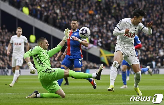 (런던 로이터=뉴스1) 우동명 기자 = 토트넘의 손흥민이 2일(현지시간) 영국 런던 토트넘 홋스퍼 스타디움에서 열린 EPL 크리스털 팰리스와 경기서 상대 선수 샘 존스톤과 볼을 다투고 있다. 2024. 3. 4