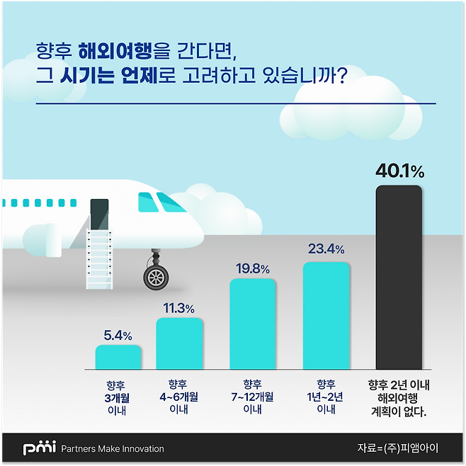 이는 50대 32.6%와 큰 차이를 보이는 것으로, 연령대가 낮을수록 해외 여행 계획이 없는 것으로 분석된다는 게 피앰아이의 설명입니다.