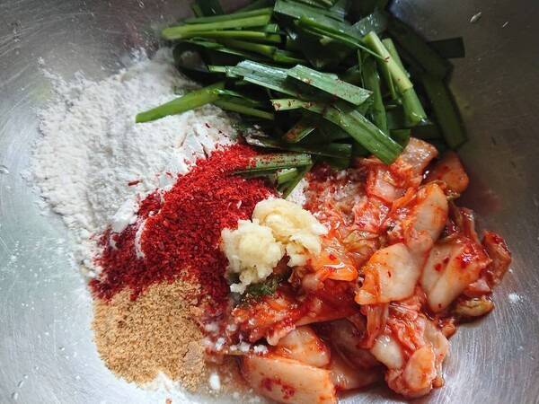 1. 김치전 재료는 부침가루 대신 통밀가루나 귀리가루 등 저혈당 식재료로 바꾸고, 반죽에 채소를 추가해 식이섬유를 보강합니다.