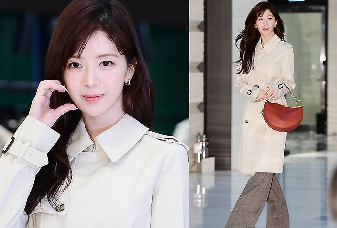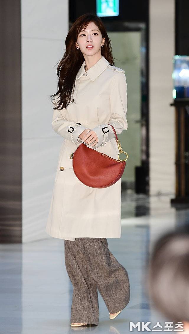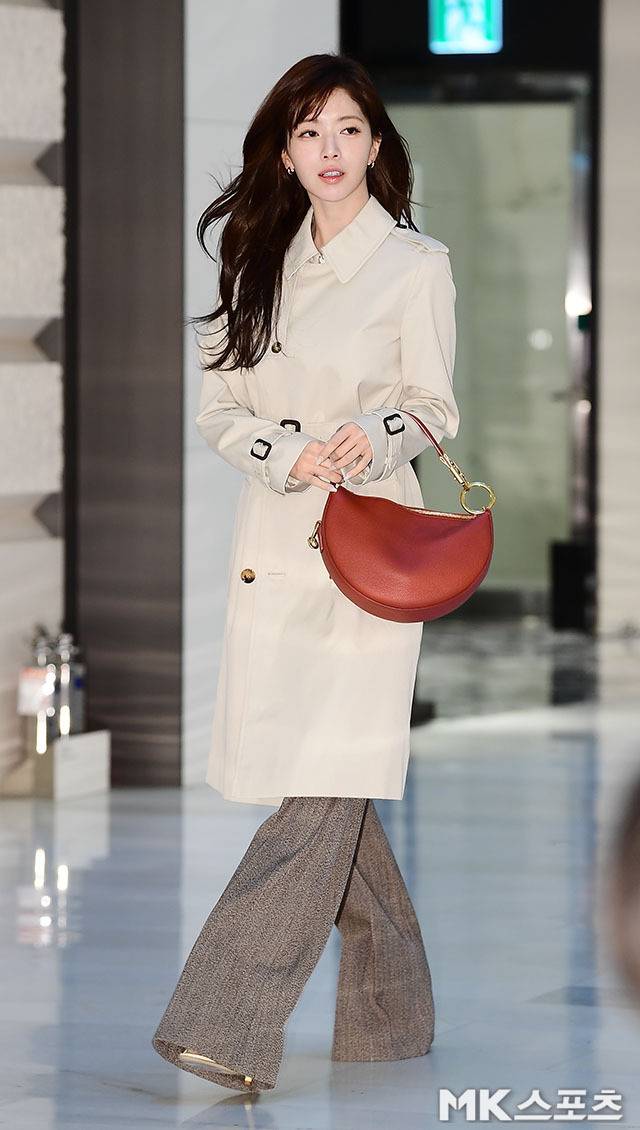 노정의는 깔끔한 아이보리 컬러의 트렌치코트를 착용해 부드러운 실루엣을 강조하며 단아한 분위기를 배가시켰습니다.