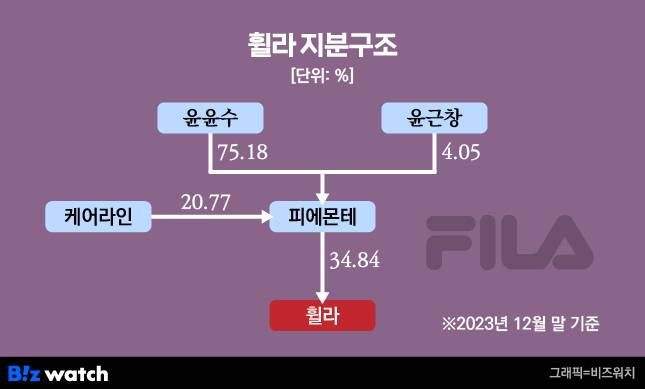윤윤수 회장과 윤근창 사장은 휠라홀딩스의 지분을 보유하지 않고 있다. 대신 지분 100%를 보유한 가족회사 피에몬테를 통해 지주사 휠라홀딩스를 실질적으로 지배 중이다. 지주사 위에 실질적인 지주사를 따로 둔 '옥상옥' 구조인 셈이다.