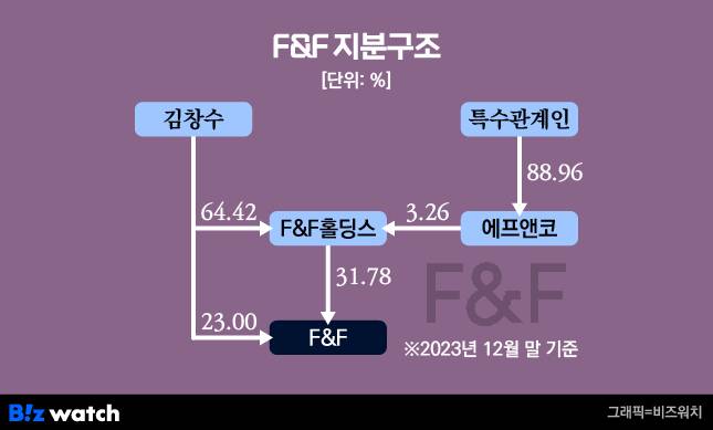 이후 김창수 회장은 자신이 보유한 지주사의 지분을 에프앤코에 시간외매매(블록딜)로 잇따라 넘기기 시작했다. 김 회장은 지난해 4월과 7월 각각 F&F홀딩스의 주식 86만3930주(2.21%)와 41만500주(1.05%)를 에프앤코에 매각했다. 올 3월에도 F&F홀딩스 61만8420주(1.58%)를 에프앤코에 넘겼다. 에프앤코는 이 거래로 F&F홀딩스 지분율을 4.8%까지 늘렸다.