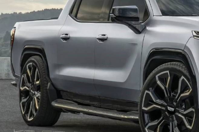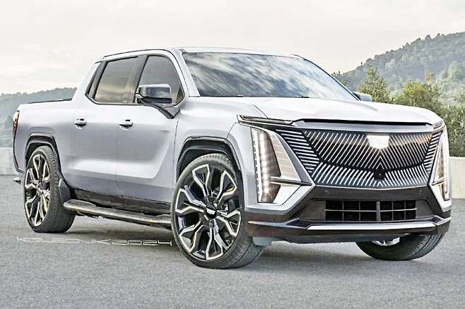 최근 화제가 된 캐딜락 픽업트럭 이미지는 디자이너 ‘켈소닉’이 제작한 가상 렌더링입니다. 이 이미지는 캐딜락 에스컬레이드 IQ의 최신 전기차 디자인을 GMC 시에라 드날리 EV의 차체에 접목시켰습니다. 전면부는 기존 에스컬레이드 IQ의 디자인 요소를 그대로 반영하여, 수직적인 주간주행등과 대형 라디에이터 그릴이 조화를 이루고 있습니다.