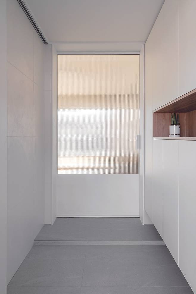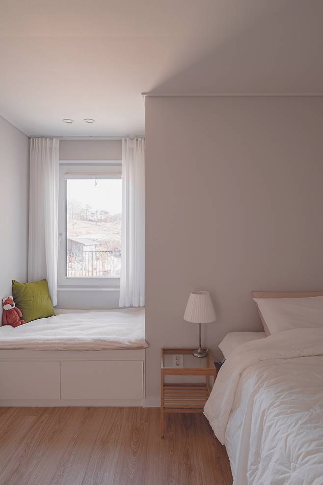 자녀 방에는 윈도우시트를 한 켠에 배치해 면적은 협소하지만, 폭을 넉넉하게 만들어 충분한 휴식을 취할 수 있도록 계획했다. 공용으로 이용되는 화장실은 은은한 색감의 포세린타일로 벽과 바닥을 일체시켜 건축주가 전반적으로 원했던 깔끔하고 심플한 분위기를 유지했다. 특히 요즘 이용의 편리함을 위해 분리형 화장실과 건식 세면대를 희망함에도 이곳 주택에는 건식 세면대를 계획하지 않았다. 화장실을 분리해 이용하지 않아도 충분하다는 건축주의 취향을 반영해 이질적이지 않은 안정된 공간을 완성했다.