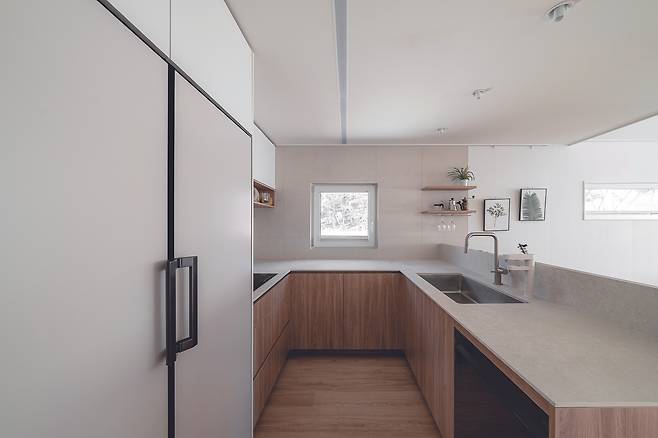 각각의 공간들이 뚜렷이 구분돼 독립적인 역할에 충실하기를 원했던 건축주의 스타일을 반영해 주방과 거실을 명확하게 나눴으며, 개방형 입구를 만들어 포인트를 더했다. 거실은 온전히 휴식을 취할 수 있는 쾌적한 공간으로 이용할 수 있으며, 주방은 조금 더 적극적으로 공간을 활용할 수 있다. 거실과 주방 및 다이닝룸 공간 등 공적 공간의 반대편에는 안방, 자녀방, 욕실 등 프라이빗한 사적 공간을 배치했다.
