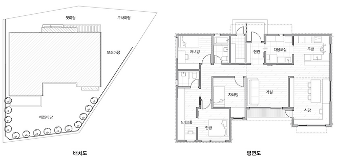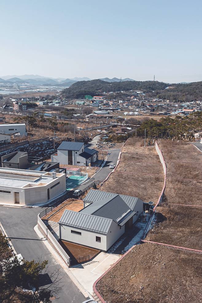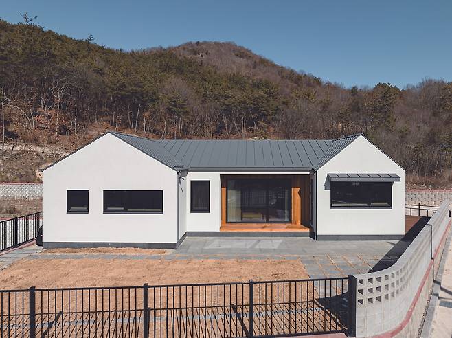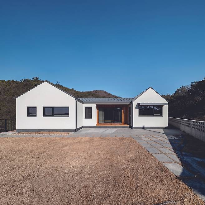 나지막한 오르막길을 오르다보면 삼거리와 함께 주택을 마주하게 된다. 정면으로 가장 먼저 접하게 되는 집이기 때문에 단정하고 깔끔한 분위기의 외장재와 주택 형태를 계획했다. 남향의 햇빛이 드리우는 집은 눈부신 스타코와 두 개의 정돈된 박공지붕 그리고 H자 형상의 안정적인 주택 형태로 완성해 주변의 자연 경관 분위기까지 단정함으로 물들인다. 남향에 앞마당을 배치했으며, 이 외의 자투리 공간을 다양한 쓰임새의 마당으로 나눠 프라이빗한 뒷마당과 주차공간, 그 외 보조마당을 계획하게 됐다. 높낮이가 있는 택지였지만 이미 평평하게 잘 조성돼 있었기 때문에 새로 땅을 파서 주차장을 만드는 공정을 생략하고, 자투리 땅에 주차마당을 만들었다.