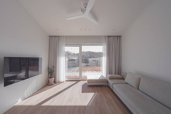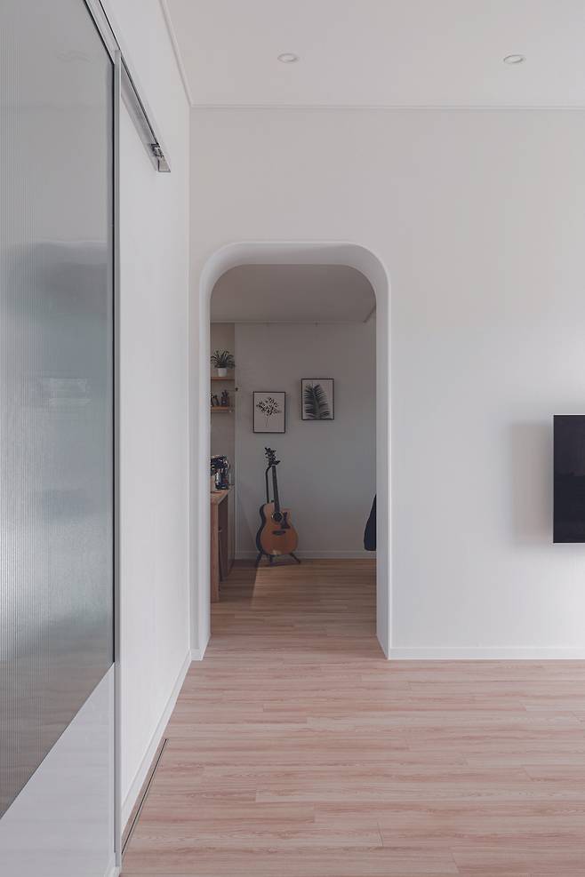 주택 외관만큼이나 단정하고 심플한 분위기를 자아내는 현관을 지나면 툇마루의 고즈넉한 분위기와 함께 남향의 햇빛이 가득 드리우는 거실에 들어서게 된다. 거실은 미니멀한 취향이 돋보이는 공간이다. 밝은 톤의 마루가 공간을 더욱 깔끔하고 심플하게 강조하고 있다. 주방으로 이어지는 입구를 라운드로 계획해 공간에 안정감을 부여하고, 볕의 따스함이 담긴 툇마루에서는 가만히 앉아 자연의 온기를 느끼며 전원을 만끽할 수 있다.